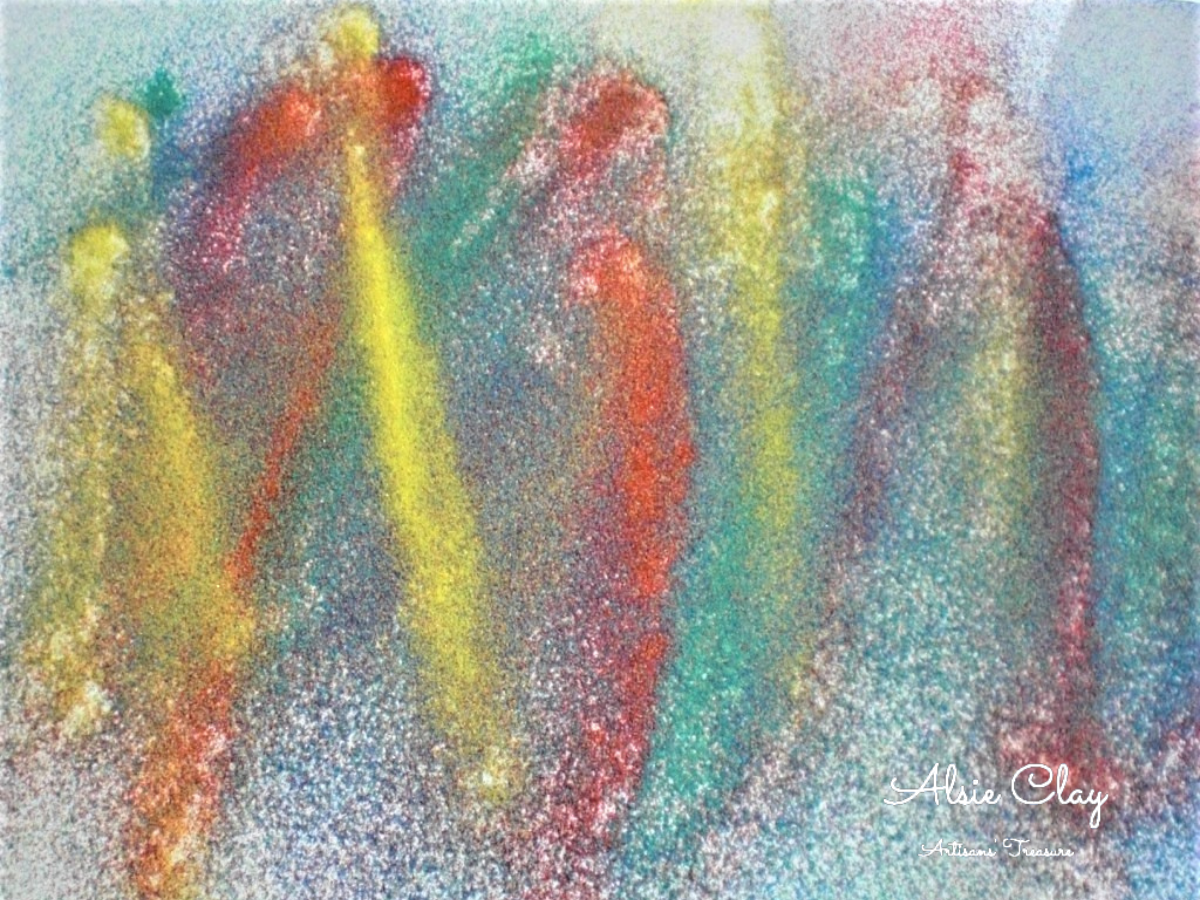 Energetic art created with particulate matter, including colored sand, or watercolor paint